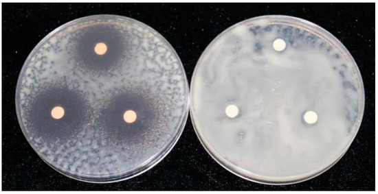 In this study, 2,4-dihydroxy-7-methoxy-1,4-benzoxazine-3-one (DIMBOA) and its derivatives 2-benzoxazolinone (BOA), 6-chloro-2-benzoxazolinone (CDHB), and 2-mercaptobenzothiazole (MBT) efficiently inhibited the growth of R. solanacearum (Table 1). DIMBOA possesses moderate antibacterial activity against R. solanacearum. Antibacterial activity was enhanced with increasing concentration of DIMBOA and its derivatives, and the highest activity was obtained from CDHB and DIMBOA at 300 μg/disc. Relative antibacterial activity showed differences correlated with the concentration of DIMBOA and its derivatives. The results also showed that hydrosulphonyl and chlorine substituents (Figure 1) enhanced the bactericidal activity against R. solanacearum. The solvent DMSO did not affect the growth of R. solanacearum on the plates after 24 h (Figure 2).