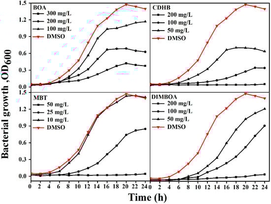 The antibacterial activity of DIMBOA and its derivatives were evaluated by examining the optical density (OD) growth curves. Nine sterilized triangle flasks were prepared for each derivative. CDHB and DIMBOA dissolved in DMSO were added into 100 mL of rich B medium to obtain final concentrations of 200, 100, and 50 mg/L. BOA was adjusted to 300, 200, and 100 mg/L, and MBT had lower concentrations of 50, 25, and 10 mg/L and with 1% DMSO as control. The medium was inoculated with 500 μL of the overnight-cultured bacterial suspension (OD600 = 1.0) and incubated at 180 r/min for 24 h at 30 ± 1 °C. Cell density was detected by measuring OD600 values at 2-h intervals during the 24-h cultivation. The OD600 values were recorded using an Evolution 300 UV-Vis spectrometer (Nicolet, Madison, WI, USA,). Each concentration was determined in triplicate and calculated to obtain the average value.