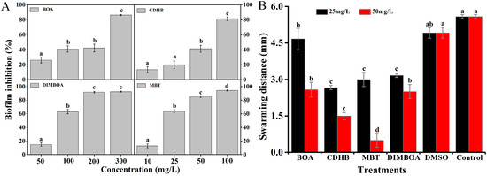 As shown in Figure 4A, DIMBOA and its derivatives significantly reduced the biofilm formation of R. solanacearum; CDHB especially reduced biofilm formation by 81.42% at a concentration of 100 mg/L compared with 41.11% by BOA treatment. MBT and DIMBOA also significantly reduced the biofilm formation with an inhibitory rate of 60% or higher, especially the concentrations up to 25 and 100 mg/L, respectively. The preliminary results showed that MBT exhibited the highest inhibitory ability on R. solanacearum biofilm formation, followed by CDHB, DIMBOA, and BOA. The inhibitory activity of DIMBOA and its derivatives were concentration dependent. The motility of R. solanacearum has been demonstrated at a molecular level to be important in biofilm formation and pathogenicity [16]. Thus, the swarming motility under the treatment of DIMBOA and its derivatives was also investigated. The results indicated that DIMBOA and its derivatives could significantly inhibit swarming motility at concentrations 25 and 50 mg/L after 24 h (Figure 4B). At 25 mg/L, the diameters of the migration zone of CDHB and MBT were decreased by 1.32- and 2.50-fold compared with DMSO.
