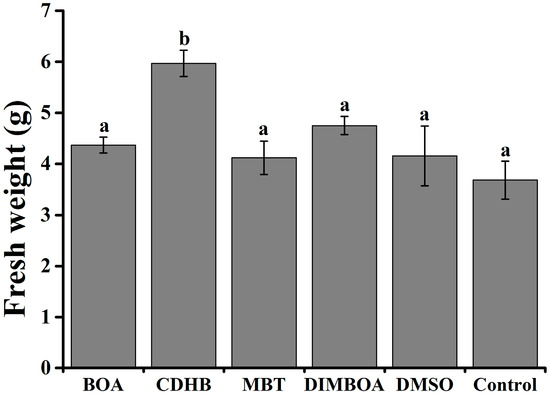 Effects of DIMBOA and its derivatives at the minimum inhibitory concentrations on tobacco fresh weight. The 10-mL solution of DIMBOA and its derivatives (MICs) and DMSO (0.3%) were respectively irrigated into the rhizosphere of each 4-week-old tobacco seedling, then the fresh weight was measured after 7 days. The assays were independently repeated three times. BOA at concentrations of 300 mg/L; CDHB at concentrations of 100 mg/L; MBT at concentrations of 50 mg/L; DIMBOA at concentrations of 200 mg/L. The error bars indicate the standard error of the mean from three replicates. Lower case letters indicate significant differences according to Duncan’s test (p < 0.05).