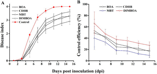 DIMBOA and its derivatives at the concentration which were effective against R. solanacearum in vivo. Nevertheless, pot experiment demonstrated that these compounds have no toxic on tobacco seedlings (Figure 5), and low cytotoxicity on human cells [17]. All treatments indicate that average levels of fresh weight were higher than control. Unexpectedly, CDHB could promote the fresh weight significantly. In addition, previous reports demonstrated that DIMBOA plays an important role in the resistance of plants [18,19]. Therefore, the incidence of disease from 1 to 13 days after treatment with DIMBOA and its derivatives (10 mg/L) and control (0.05% DMSO) on tobacco roots was investigated. The application of DIMBOA and its derivatives did not provide an effective control of bacterial wilt incidence. However, bacterial wilt index in the treated plants was reduced compared with the control (Figure 6A). The control efficiency of DIMBOA and MBT were kept at the lowest levels of 27.24% and 9.55%, respectively, at the 15th day (Figure 6B). As a whole, DIMBOA showed the possibility of elicitors and reduced the disease index of bacterial wilt.