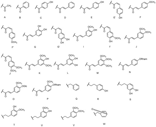 Cinnamic acid sugar ester derivatives (CASEDs) are an important type of natural product. Structurally, they have a glycosyl linked with the phenylacrylic group using ester bonds. The glycosyl part maybe contain one, or several sugar units, which are attached via an -OH group to another -OH by condensation reactions. So far, glucopyrannosyl, rhamnopyranosyl, fructofuranosyl, arabinopyranosyl, galactopyranosyl, apiofuranosyl, xylopyranosyl, lyxopyranosyl, allopyranosyl, fucopyranosyl and lactopyranosyl moieties have been reported to occur in CASEDs. The glycosyl portion usually has an anomeric carbon of one sugar connected to the C-2, C-3 and C-4 of the other glycosyl group. Here, the non-anomeric carbon of the glycosyl part connected (Table 3).
