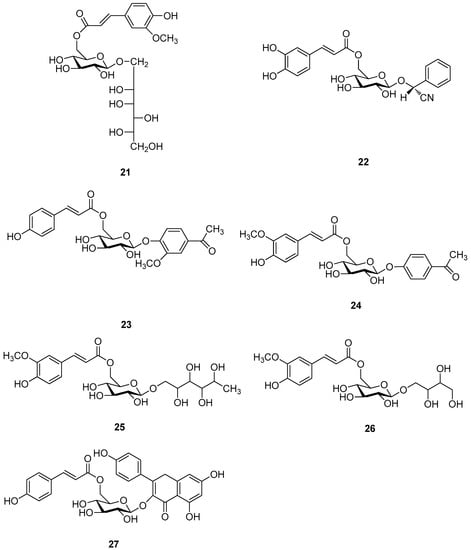 The 27 monosaccharide [16,18,20,21,22,23,24,25,26,27,28,29,30,31,32,33,34,35] esters 1–10, 21–27 represent the simplest structures found among CASEDs (Figure 1, Figure 2, Figure 3, Figure 4 and Figure 5). The main structural moiety of these compounds (Figure 2 and Figure 5), is a β-d-glucose ester, or an α-l-rhamnose ester in compounds 11–15 (Figure 3). Compounds 16–20 exist as anomeric mixtures in solution and the phenylacrylic group is often attached at the C-6 position of the glycosyl moiety. Coincidentally, compounds 11–15 possess the same p-methoxy- cinnamoyl group attached to the rhamnose unit though an ester bond in the monosaccharide ester. Compounds 2, 4 and 20 are phenylpropanol esters linked with glucose as the important part. Compounds 1 and 3 contain two different phenylpropanols attached to one glucose molecule. Ningposide D (14) [16] is also an anomeric mixture of rhamnose esters and the anomeric ration α/β is 3:1, here it was drawn as the α-l-rhamnose ester. Isolated from the underground parts of Globularia orientali, globularitol (21) has a carbohydrate chain moiety, formed by a glucitol group. It has the ability to efficiently scavenge free radicals [32]. Grayanin (22) has a mandelonitrile unit connected at the C-1 position in the glucose. This compound is a unique cyanogenic glycoside among CASEDs [20]. The benzeneacetonitrile group of grayanin may be originated from phenylalanine from the biosynthetic pathway viewpoint. Up to now, paederol A (25) and B (26), are the only two reported CASEDs with acyclic sugars. By the way, paederol A and B did not exhibit obviously cytotoxicity in the Lu1 (lung cancer), LNCaP (prostate cancer) and MCF-7 (breast cancer) [34]. Kaempferol 3-O-β-d-(6-O-p-E-coumaroyl)-glucopyranoside (27) is the only flavonoid of CASEDs, which possess inhibitory activity towards a drug-metabolizing enzyme, CYP3A4 [35].