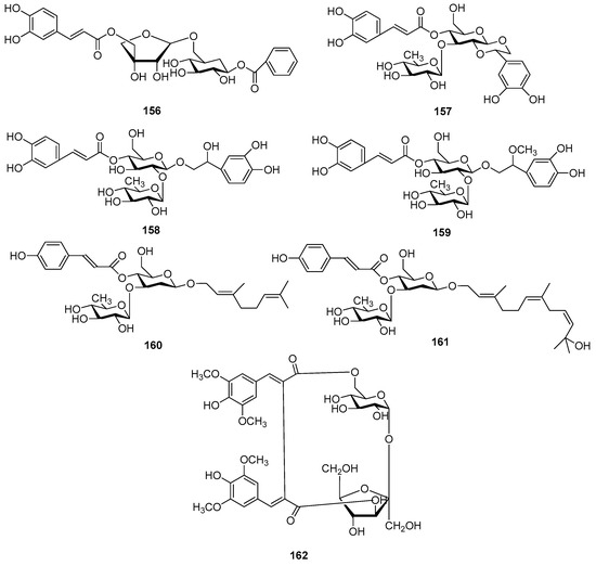Sibiricose A5 (28), tenuifoliside A (51) and DISS (73) from the root of Polygala sibirica (Yuanzhi) [13], have the same core sucrose unit and the ester is always connected at the C-6 position of α-d-glucose and C-3 position of β-d-fructose. These compounds have anti-depression properties. In 1968, verbascoside (=acteoside 131) was the first CASED isolated from the medical plant Syringa vulgaris (Oleaceae) [3]. So far, it has been reported in nine families. Magnoloside A (121) from medicinal plants of the Magnoliaceae family is unique among the phenylpropanoids in rarely occurring alone as the core glycosyl [62]. In addition, crenatoside (157) has a novel annular framework which attaches the C-1 and C-2 of the glucose to a hexatomic oxygen ring [91]. Glomeratose E (162) possesses a (E,E)-β,β′-bis-sinapoyl group between the α-d-glucose and β-d-fructose [38].