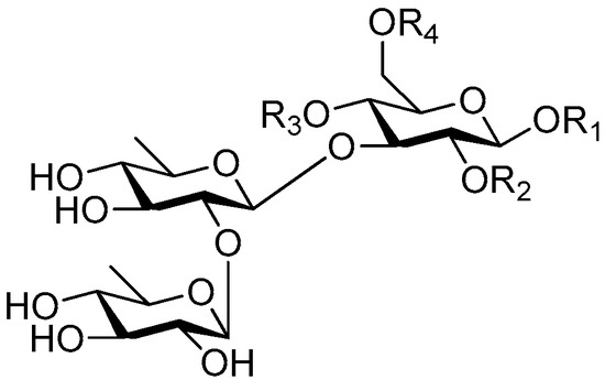 Disaccharide esters 28–162 (Figure 6, Figure 7, Figure 8, Figure 9, Figure 10, Figure 11, Figure 12, Figure 13, Figure 14, Figure 15 and Figure 16) [4,5,10,13,15,17,19,24,25,29,36,37,38,39,40,41,42,43,44,45,46,47,48,49,50,51,52,53,54,55,56,57,58,59,60,61,62,63,64,65,66,67,68,69,70,71,72,73,74,75,76,77,78,79,80,81,82,83,84,85,86,87,88,89,90,91] constitute the largest group among CASEDs. Their glycosyl parts include glycosyl groups, with glucopyrannosyl, rhamnopyranosyl, fructofuranosyl, and arabinopyranosyl ones being the most important and sucrose units as found in compounds 28–120, 162 are more rare,. Among them, the glycosyl unit in 28–120 has the anomeric carbon on α-d-glucose linked to a β-d-fructose. The ester bond is often formed at the C-6 position of α-d-glucose and C-3 position of β-d-fructose. The compounds 122–140 are composed of α-l-rhamnose and β-d-glucose, with a connection between the C-1 location of α-l-rhamnose and C-3 position of β-d-glucose. The cinnamic acid unit is mainly connected to the C-4 position of β-d-glucose, and less often in the C-6 location. The glycosyl moieties of compounds 145–147 are similar to those of 122–140, and the configuration of the hydroxyl attached to the anomeric carbon of glucose could not be determined. The aglycone part of compounds 150–155 is two β-d-glucoses joined by C-1 and C-6, and the functional group is attached to the C-2 position of the parent nucleus.