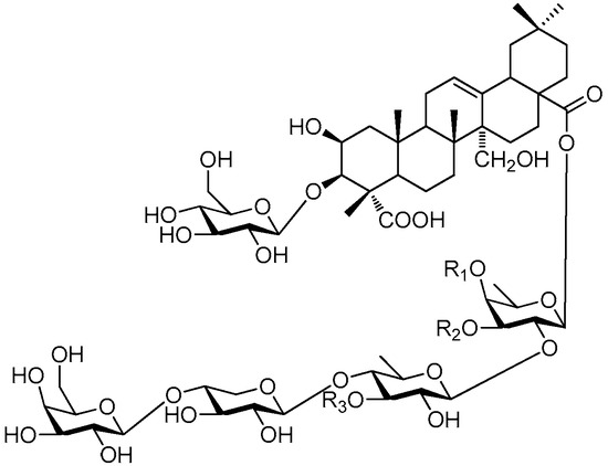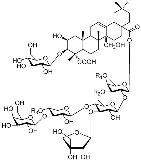 - Saitoh, H.; Miyase, T.; Ueno, A. Senegoses F-I, Oligosaccharide Multi-Esters from the Roots of Polygala senega var latifolia Torr. Et Gray. Chem. Pharm. Bull. 1993, 41, 2125–2128. [Google Scholar] [CrossRef] [PubMed]