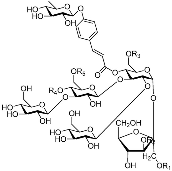 - Jiménez, C.; Villaverde, M.C.; Riguera, R.; Castedo, L.; Stermitz, F. Phenylpropanoid glycosides from Mussatia hyacinthina. J. Nat. Prod. 1989, 52, 408–410. [Google Scholar] [CrossRef]