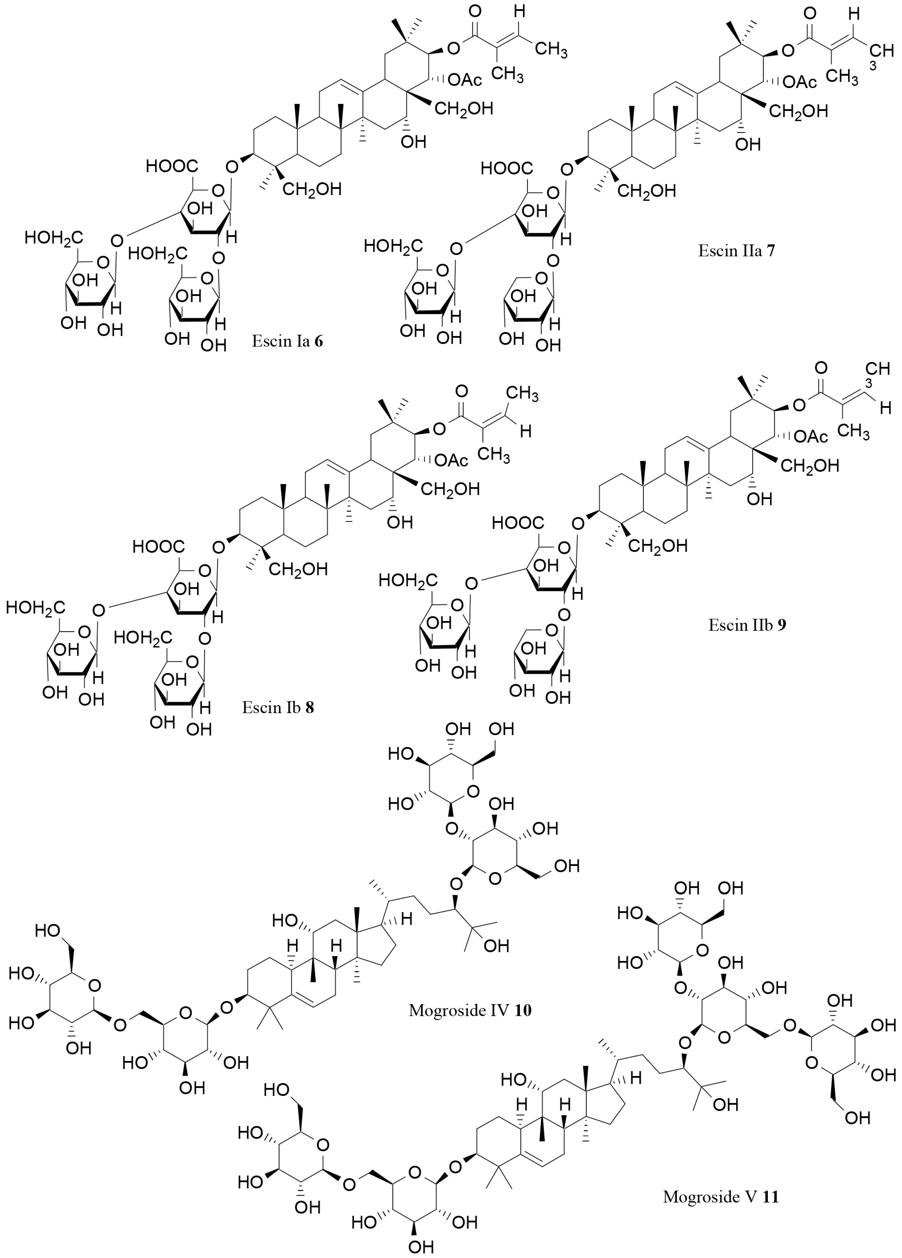 - Hu, J.-N.; Zhu, X.-M.; Han, L.-K.; Saito, M.; Sun, Y.-S.; Yoshikawa, M.; Kimura, Y.; Zheng, Y.-N. Anti-obesity effects of escins extracted from the seeds of Aesculus turbinata BLUME (Hippocastanaceae). Chem. Pharm. Bull. 2008, 56, 12–16. [Google Scholar] [CrossRef] [PubMed]