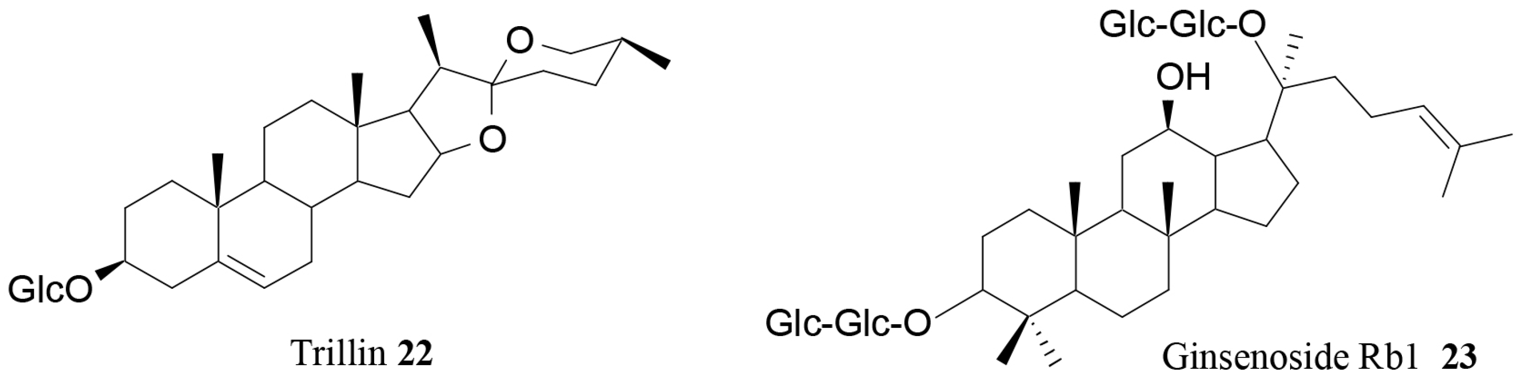 | Trillin (22) | Dioscorea nipponica Makino | In vivo | Antihyperlipidemic activity | [82] |