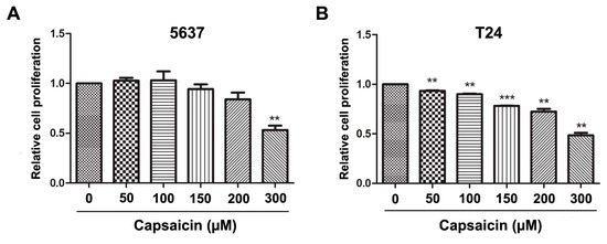 To investigate the effects of CAP on cell viability in the BCa cells, 5637 (Figure 1A) and T24 (Figure 1B) cells were treated with CAP at different concentrations (0, 50, 100, 150, 200 and 300 µM) for 48 h. An MTT assay was used to measure the cell viability. The results exhibited a reduced tendency of relative cell proliferation rate in a dose-dependent manner and a significantly reduction in both 5637 and T24 cells at 300 µM. In the following, in vitro studies with CAP at 0 µM (control), 150 µM (moderate dose) and 300 µM (high dose) were done.