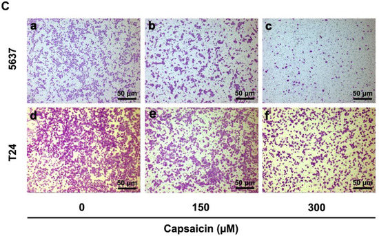 Capsaicin (8-methyl-N-vanillyl-6-nonenamide) is the main pungent ingredient in Capsicum species plants, consumed as a food additive throughout the world for its pungency [11]. Capsaicin (CAP) is a highly selective agonist for the transient receptor potential vanilloid type 1 (TRPV1) [12,13]. In addition to the prototypical function of Ca2+ channel, TRPV1 has been described to be correlated with BCa [14] and also revealed as a target for drug development [15,16]. Recently, CAP has been reported for its analgesic, antioxidant, anti-inflammatory, and anticancer activity [16,17]. Moreover, CAP has been suggested a potential clinical significance in tumor therapy [18,19].
