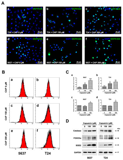 To investigate the effects of CAP on ROS production in BCa cells, we analyzed cellular ROS levels in 5637 and T24 cells after treatment with CAP at 0, 150 and 300 µM for 48 h by DCFH-DA staining (Figure 2A) and flow cytometry (Figure 2B). Indeed, we observed a clear dose-dependent increase in cellular ROS levels after incubation with CAP by staining (Figure 2C (a,b)). Consistently, the results examined by flow cytometry analysis also showed a significantly higher fluorescence of ROS in 300 µM group than the control group (Figure 2C (c,d)). Moreover, western blot analysis revealed that CAP could induce a strong increase of protein levels for anti-oxidative enzymes (Figure 2D), such as mitochondria superoxide dismutase 2 (SOD2), transcription factor FOXO3a and Catalase, one of the most important antioxidant enzymes, which catalyzes the decomposition of H2O2 to H2O [27].