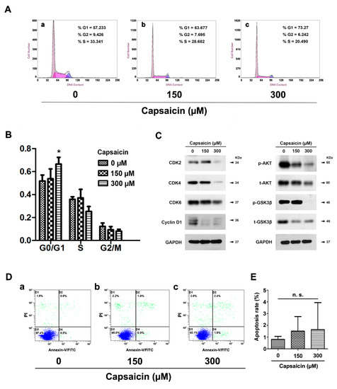 CAP triggered BCa cell cycle arrest but no significant effect on apoptosis in vitro. (A) Representative flow cytometry images for cell cycle alterations of CAP-treated 5637 cells at 0 (a), 150 (b) and 300 μM (c) for 48 h; (B) Statistical analysis of cell cycle alterations revealed a significant increased cell number at G0/G1 phase in the CAP-treated 5637 cells at 300 μM. All values shown were mean ± SD of triplicate measurements and repeated three times with similar results, * p < 0.05; (C) Western blot analysis revealed that the proteins involved in the G0/G1 phase regulation (CDK2, CDK4, CDK6, cyclin D1) and the PI3K/Akt/GSK3β signaling pathway (total and phosphorylated AKT/GSK3β) were all strongly downregulated after CAP treatment. GAPDH was used as a loading control. Cell types, concentrations of CAP treatment and protein masses were indicated; (D) Representative flow cytometry images for cell apoptosis of the CAP-treated 5637 cells at 0 (a), 150 (b) and 300 μM (c) for 48 h; (E) Statistical analysis of apoptotic rate in 5637 cell lines after CAP treatment, suggesting that no significant alteration of cell apoptosis was induced by CAP in the 5637 cells. All values shown were mean ± SD of triplicate measurements and repeated three times with similar results (n.s. = no significance).