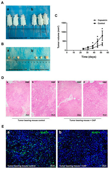 Before the experiments, the male NOD/SCID mice were adapted to the environment for a week. All mice were housed in a specific pathogen-free, temperature and humidity-controlled environment with food and water in their cages. 5637 cells (4 × 107/mL in PBS) were injected in the right flank of the male NOD/SCID mice (n = 6) at day 35 subcutaneously (100 µL for each mouse). The mice were then feed for 21 days and the transplanted tumors were approximately at 50 mm3. CAP (20 mg per kg body weight) was injected to the mice (n = 3) into the peritumoral area every two days for four weeks. To prepare the injection solution, CAP was initially dissolved in ethanol to a concentration of 200 mM and subsequently dissolved in saline to a concentration of 2 mg/mL. The final concentration of ethanol was 2.59%. Saline containing 2.59% ethanol injected into the mice (n = 3) was used as a control. The tumor size for each mouse was measured every week using a caliper and calculated using the formulation as: tumor volume (mm3) = π/6 × length × width2 [54]. No skin ulcers were observed.