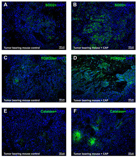 Immunofluorescence analysis revealed a strong increase in signal intensity for mitochondrial SOD2 (Figure 5B) and peroxisomal Catalase (Figure 5F) in the tissues from the CAP-injected tumor bearing mice, compared with the control group (Figure 5A,E).