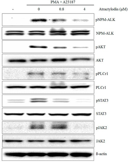 (D) HMC-1 was treated with the indicated concentrations of Atractylodin for 0.5 h prior to being incubated with PMA (50 nM) plus A23187 (1 μM) for 0.5 h and phospho and total NPM-ALK, AKT, PLCγ1, JAK2, and STAT3 were detected by immunoblot analysis as described in Materials and Methods.