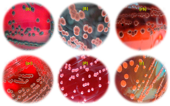 Morphotypes obtained on Congo red agar based on the colorimetric scale: (b): black colonies; (B): bordeaux colonies; (rb): red colonies with a darkening at the center; (pr): pink colonies with a red centre; (P): pink colonies; (r): red colonies.