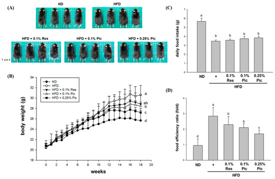 Effect of piceatannol supplementation on body weight in HFD-fed C57BL/6 mice. (A) Images of representative mice from each group; (B) Weekly body weight measurements over 18 weeks; (C) Daily food intake and (D) food efficiency ratio. Data are expressed as the means ± SE (n = 8 per group). The values with different letters are significantly different (p < 0.05) as determined by Duncan’s multiple range test.