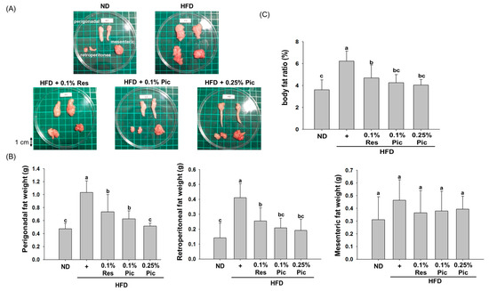 Effect of piceatannol supplementation on adipose tissue weight in HFD-fed C57BL/6 mice. (A) Representative images of fat pads from each group; (B) The weight of perigonadal, retroperitoneal and mesenteric adipose tissues; (C) Body fat ratio, which was calculated using the following formula: adipose tissue weight (perigonadal + retroperitoneal + mesenteric fat weight)/body weight × 100 (%). Data are expressed as the means ± SE (n = 8 per group). The values with different letters are significantly different (p < 0.05) as determined by Duncan’s multiple range test.