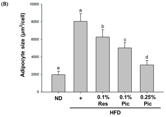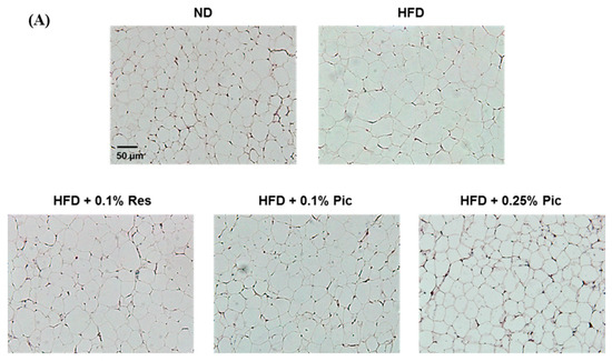 Figure 3B illustrates the quantified area of perigonadal adipocytes. The adipocyte area of the HFD group was approximately 8000 μm2, which was significantly greater than the other groups. Intake of 0.1% Res with a HFD significantly reduced adipocyte area to approximately 6000 μm2. The same dosage of Pic reduced the area to 5000 μm2, and 0.25% Pic significantly decreased it to 3000 μm2, suggesting a dose-dependent effect of Pic on adipocyte size.