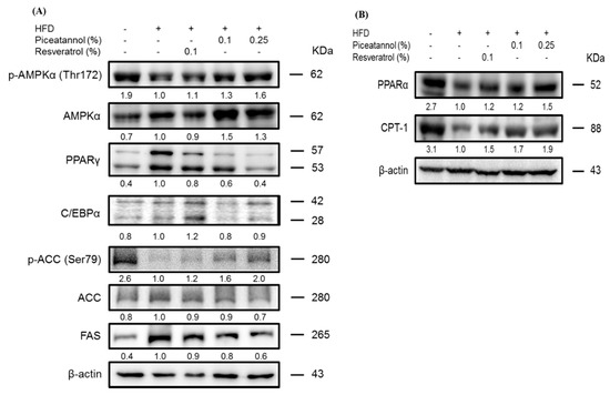 Effect of piceatannol supplementation on (A) adipogenic proteins and (B) beta-oxidation-related proteins in HFD-fed C57BL/6 mice. Perigonadal protein levels were evaluated by western blot analysis. The values under each lane indicate relative density of the band normalized to β-actin. The western blot is representative of at least three independent experiments.