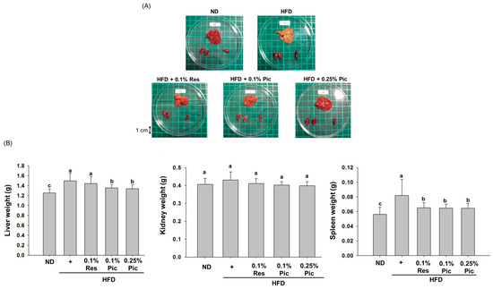 Effect of piceatannol supplementation on organ weight in HFD-fed C57BL/6 mice. (A) Morphology of the organs; (B) Weights of the liver, kidney and spleen. Data are expressed as the means ± SE (n = 8 per group). The values with different letters are significantly different (p < 0.05) as determined by Duncan’s multiple range test.