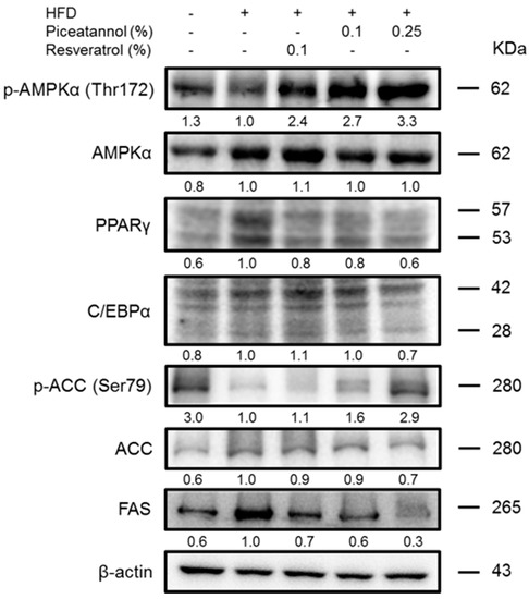 Effect of piceatannol supplementation on hepatic adipogenic protein in HFD-fed C57BL/6 mice. Hepatic adipogenic protein levels were evaluated by western blot analysis. The values under each lane indicated relative density of the band normalized to β-actin. The western blot is representative of at least three independent experiments.