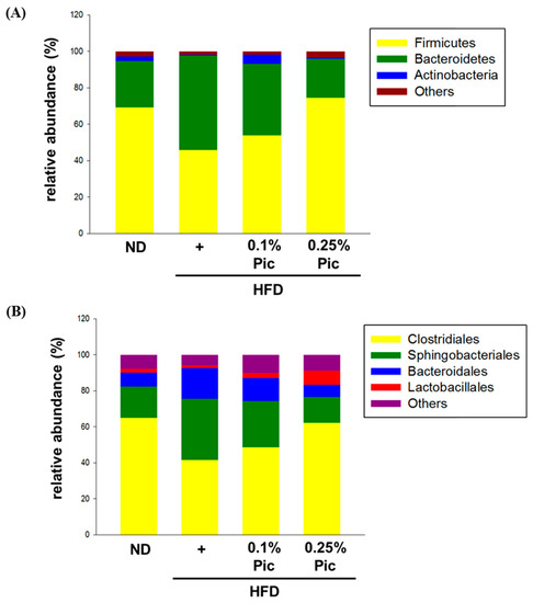 Grouping gut bacteria by order, Clostridiales showed the highest proportion in each group (Figure 7B). Consumption of a high-fat diet decreased its percentage to 41.53%, and supplementation with Pic increased the Clostridiales percentage to 48.56% and 62.34% in the 0.1% Pic and 0.25% Pic groups, respectively. Sphingobacteriales levels were 34.07% in HFD group. Treatment with 0.25% Pic decreased the Sphingobacteriales percentage to 14.29%, closer to the proportion of 17.33% in ND group. Bacteroidales had similar trend as Sphingobacteriales: supplementation with Pic decreased the percentage of Bacteroidales compared with the HFD group. Table 3 highlights the most abundant genera within the Firmicutes and species within the Bacteroidales among each treatment group. The HFD group had higher number of Pedobacter kwangyangensis and Dysgonomonas wimpennyi from the Bacteroidales, and lower numbers from Blautia from the Firmicutes compared with the ND group. Thus, both 0.1% and 0.25% Pic reversed the percentage of gut microbiota compared with HFD group. Moreover, 0.25% Pic showed almost the same percentage of gut microbiota compared with ND group. The result showed that Pic was able to recover the alterations of gut microbiota caused by the HFD.