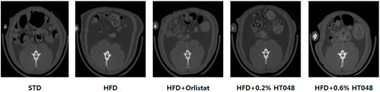 Effect of HT048 on abdominal fat accumulation in HFD-fed obese rats. Representative microCT scanning images of abdominal WAT for each group are shown. White, gray, and black parts roughly indicate bone, muscle or viscera, and fat, respectively.
