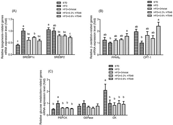 Effect of HT048 on mRNA expression of genes related to hepatic lipogenesis (A); β-oxidation (B); and glucose metabolism (C) in HFD-fed obese rats. Values are mean ± SD (n = 12 for each group). Data were analyzed by one-way analysis of variance (ANOVA) followed by Duncan’s multiple range test. abc Means not sharing common letters are significantly different among the groups at p < 0.05.