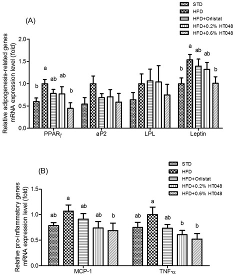 Effect of HT048 on mRNA expression of genes related to WAT adipogenesis (A) and pro-inflammatory (B) in HFD-fed obese rats. Values are mean ± SD (n = 12 for each group). Data were analyzed by one-way analysis of variance (ANOVA) followed by Duncan’s multiple range test. ab Means not sharing common letters are significantly different among the groups at p < 0.05.