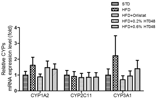 Cytochrome P450 monooxygenases are a superfamily of heme-thiolate enzymatic proteins involved in the activation and metabolism of drugs [47]. Induced level of CYPs genes indicates possible side effects induced by herb-drug interactions. Among numerous CYP isozymes identified to date, CYP1A2, CYP2C11 (corresponding to human CYP2C9), and CYP3A1 (corresponding to human CYP3A4) play the dominant roles [48]. Therefore, we determine the effects of HT048 on the CYP1A2, CYP2C11, and CYP3A1 mRNA expression in liver of HFD-induced obese rat. There was no significant difference in CYP1A2, CYP2C11, and CYP3A1 among all groups. CYPs may be particularly vulnerable to modulation by dietary supplements and foods, including fruits, vegetables, herbs, spices, and teas [20]. Several studies demonstrated that high-fat diet, sex, hormonal imbalance, and so on influence the activity and expression of hepatic CYPs in rodents [47,49,50]. Thus, more research is needed to accurately determine pharmacokinetic effect of HT048 in standard rodents fed a normal diet.
