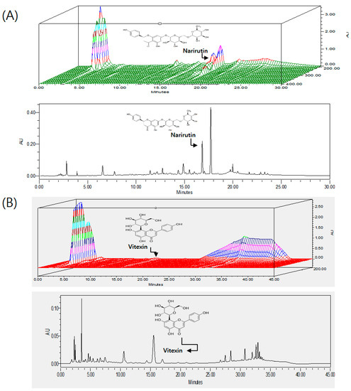 3-D HPLC chromatogram of HT048, a blend of two herbal extracts (A) C. unshiu peel of narirutin; (B) C. pinnatifida leaves of vitexin.