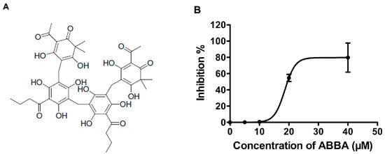 To successfully establish an infection, bacteria produce a variety of virulence factors, such as surface proteins and secreted toxins [,,]. For S. aureus and other Gram-positive bacteria, the anchorage of most surface proteins is indispensable, suggesting that the enzyme SrtA is an ideal target for the development of anti-virulence therapeutics [,]. Thus, the natural product, dryocrassin ABBA (ABBA, Figure 1A) has been screened as an effective agent against S. aureus SrtA activity using fluorescence resonance energy transfer (FRET). Consistent with previous results, the cleavage of the model substrate peptide Dabcyl-QALPETGEE-Edans (GL Biochem, Shanghai, China) through SrtA showed increasing fluorescence, detected using a microplate reader (Figure 1B). However, the addition of ABBA to the reaction system significantly decreased the fluorescence signal, indicating the inhibition of the catalytic activity of SrtA through ABBA (Figure 1B). Importantly, the IC50 of this inhibition was 24.17 μM (Figure 1B). Taken together, ABBA is an effective inhibitor of S. aureus SrtA, suggesting that this compound as a promising candidate against S. aureus infection.