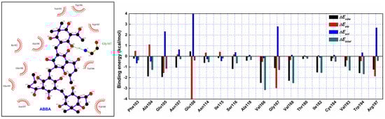 To identify the binding sites in the SrtA-ABBA complex, the MM-PBSA method was used to calculate the binding free energy between the residues surrounding the binding site and ABBA. As shown in Figure 3, an appreciable van der Waals (ΔEvdw) contribution of Val166 exists, with a ΔEvdw of ~−2.5 kcal/mol, reflecting the close proximity of the side chain of Val166 to the O3 atom of ABBA. Furthermore, Val168, Ile182 and Trp194 also have appreciable van der Waals interactions with ABBA because of the close proximity between the side chain residues and the O16, C41, O4, O3 and C8 atoms of ABBA. Interestingly, residue Gly167 showed an obvious electrostatic term (~−3.0 kcal/mol), while solvation (ΔEsol) showed unfavorable contributions at ~2.8 kcal/mol; consequently, the total energy contribution of Gly167 was strong (~−1.22 kcal/mol), indicating that a strong hydrogen bond exists between Gly167 and the O1 atom of ABBA. In addition, residues Ala104 and Glu105 also showed strong contributions to binding with ABBA, with ΔEvdw values of −1.89 and −1.91 kcal/mol (Figure 3). These results are consistent with the data shown in Figure 2, indicating that the residues Ala104/Glu105/Val166/Gly167/Val168/Ile182/Trp194 are key binding sites in the complex.