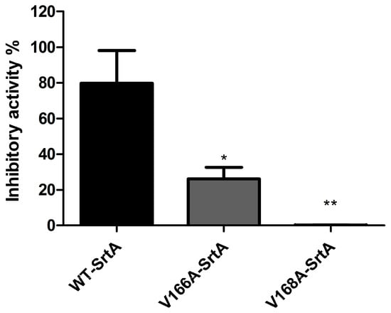 Inhibitory effects of ABBA against WT-SrtA and SrtA mutants. WT-SrtA and SrtA mutants (V166A-SrtA and V168A-SrtA) were incubated with 40 μM ABBA, and the catalytic activity of recombinant SrtA was determined as described in Figure 1B. The error bars show the standard deviations (SD). * p < 0.05, ** p < 0.01 compared with WT-SrtA.