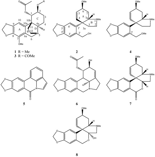 - Wagner, J.; Pham, H.L.; Döpke, W. Alkaloids from Hippeastrum equestre Herb.—5 Circular dichroism studies. Tetrahedron 1996, 19, 6591–6600. [Google Scholar] [CrossRef]