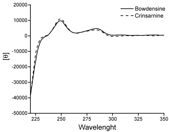 ECD spectra of crinsarnine (1) and bowdensine (3) recorded in MeOH.