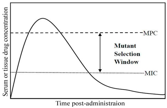 Pharmacodynamic characteristics of the mutant selection window. Drug concentrations indicated by the double-headed arrow between the mutant prevention concentration (MPC) and minimal inhibitory concentration (MIC) represent the mutant selection window.