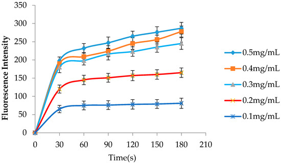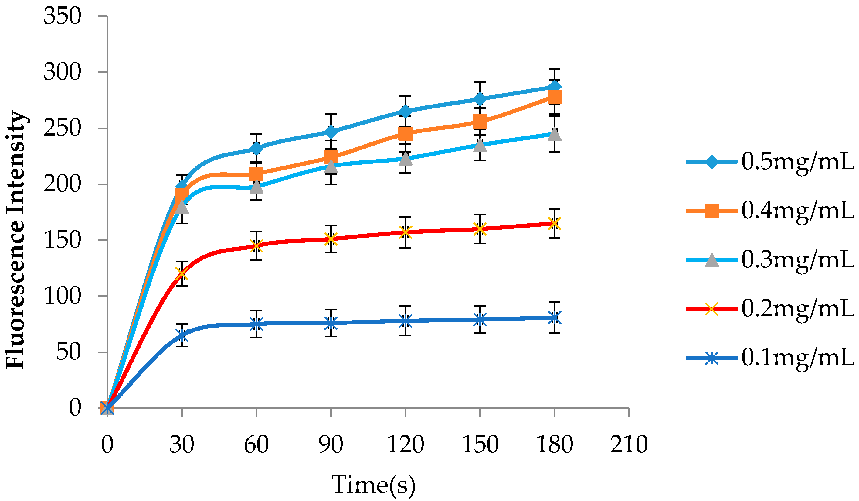 Effects of hLYS on permeability of the H. pylori outer membrane. The hLYS with different concentrations detect its ability of increasing membrane permeability through the change of the fluorescence intensity with time.