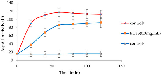 The effect of hLYS on H. pylori IM integrity was determined by measuring the release of aspartate aminotransferase (AspAT) from H. pylori into the culture medium. AspAT activity was indicated by the amount of aspartate converted to oxaloacetate by measuring the malate dehydrogenase (MDH)-catalyzed, NADH-dependent conversion of oxaloacetate to malate. The enzymatic activity of AspAT was detected by the reduction in absorbance at 340 nm. A 50 mL sample of log phase H. pylori was centrifuged at 5000× g for 10 min. The cells were collected, washed three times, and suspended in a 0.9% NaCl solution, after which the optical density at 600 nm was adjusted to 1.0 in accordance with a previously reported method with slight modifications [37]. The AspAT reaction mixture (4 mL) contained 2 mL H. pylori suspension, 1 mL hLYS at 0.3 mg/mL, 20 mM Tris (pH 7.8), 50 µM pyridoxal-5′-phosphate, 20 mM α-ketoglutarate, 50 mM l-aspartate, 0.2 mM NADH, and 12U MDH. Positive and negative controls were 0.2% Triton and 0.9% NaCl, respectively. An increase in AspAT activity was represented by the reduction in absorbance at 340 nm using a spectrophotometer. One unit of AspAT was defined as the amount of enzyme that catalyzed the oxidation of 1 µmol NADH min−1 and led to a reduction in absorbance of 0.001 min−1. AspAT activity was measured at 20 min intervals until no further increase resulting from the increasing penetration of AspAT from cells by hLYS was detected. The experiments were carried out three times to obtain the average value.