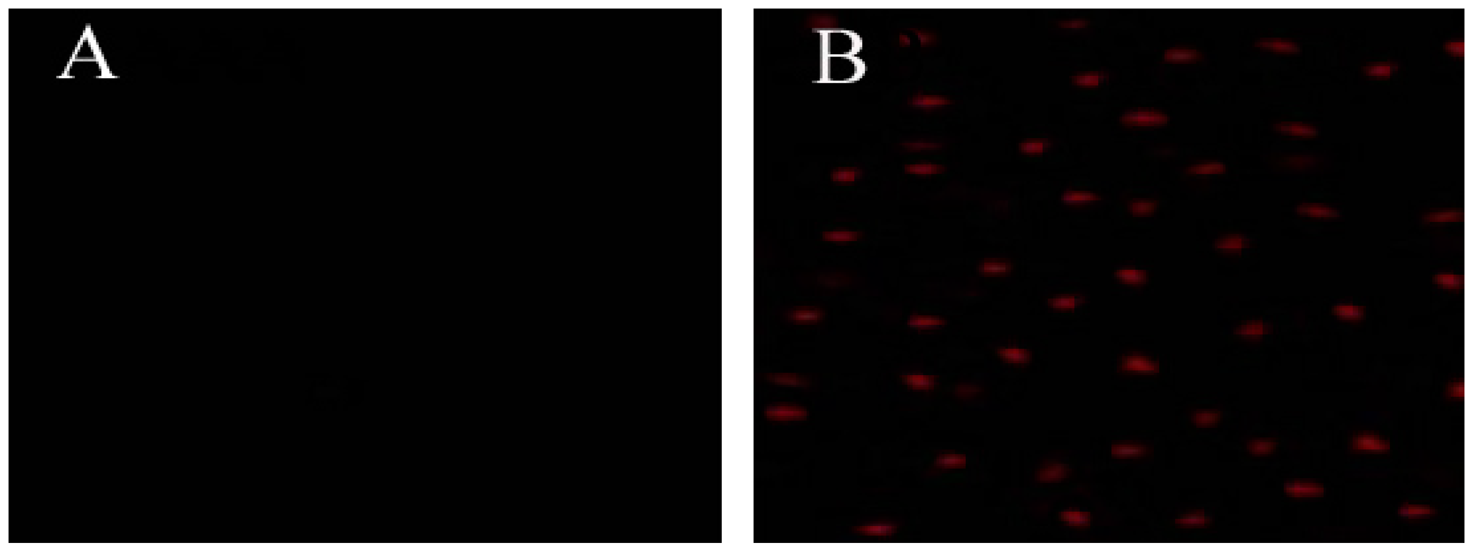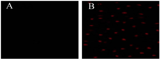 Effect of hLYS on H. pylori membrane permeabilization. H. pylori was incubated with (A) PBS (a control) or (B) 50 μM PI and 0.3 mg/mL hLYS for 90 min at room temperature under microaerophilic conditions. The cells were observed using fluorescence confocal microscopy. (A) No fluorescence was observed, indicating that PI could not enter the cells; (B) A few red fluorescence dots could be observed, demonstrating that PI could enter cells and bind to DNA.