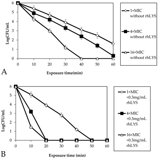 Bactericidal kinetics. The bactericidal kinetics of metronidazole without hLYS (A) and of metronidazole with 0.3 mg/mL hLYS (B) against H. pylori were monitored at 10 min intervals for 1 h at 37 °C. Subsequently, aliquots were diluted (serial 10-fold dilutions) and plated for CFU counts after 72 h incubation at 37 °C.