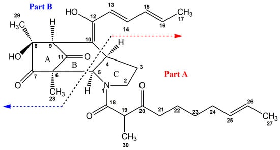 In the 1H-1H COSY spectrum, there were cross peaks from 6.66 (H-13) to 7.27 (H-14), from 7.27 (H-14) to 6.39 (H-15), from 6.39 (H-15) to 6.28 (H-16) and from 6.28 (H-16) to 1.85 (H-17), which revealed that there was a substructure of -C-13-C-14-C-15-C-16-C-17 in penicitroamide (1). Along the above substructure, the carbon chain was extended to C-12 and C-10, because of the correlations from 6.66 (H-13) to 167.8 (C-12) and 108.9 (C-10) and from 7.27 (H-14) to 167.8 (C-12). The cross peaks of 3.29 (H-9)/108.9 (C-10), 167.8 (C-12), 1.07 (H-29)/208.5 (C-7), 73.2 (C-8), 45.7 (C-9), 6.99 (H-28)/167.0 (C-6), 208.5 (C-7), 197.3 (C-11), 6.12 (8-OH)/208.5 (C-7), 73.2 (C-8), 45.7 (C-9), 23.4 (C-29) suggested that there was a five-membered ring including C-6, C-7, C-8, C-9 and C-11 and the relative locations of those five carbons in compound 1. Lastly, the cross peak of 3.29 (H-9)/108.9 (C-10) proved that the five-membered ring was linked to the above prolonged side chain by C-9. Thus, the structure of part B from compound 1 was established as shown in Figure 1. The E-geometry of the double bonds was suggested by the large J (H-13/H-14, H-15/H-16) values at 14.6 and 11.0 Hz.
