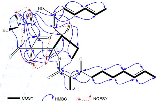 The structure of 1 was established by the comprehensive analysis of the 2D-NMR spectra including 1H-1H COSY, HSQC and HMBC. In the 1H-1H COSY spectrum, there appeared four substructures in compound 1, −2.39 (H-21)/1.39 (H-22)/1.23 (H-23)/1.89 (H-24)/5.36 (H-25, 26)/1.59 (H-27), −6.66 (H-13)/7.27 (H-14)/6.39 (H-15)/6.28 (H-16)/1.85 (H-17), −3.71 (H-2)/2.10, 1.50 (H-3)/3.35 (H-4)/4.65 (H-5) and −3.83 (H-19)/1.11 (H-30), which were proven by the corresponding HMBC cross peaks. The following correlations from 1.11 (H-30) to 50.9 (C-19), 170.7 (C-18) and 206.8 (C-20), from 3.83 (H-19) to 170.7 (C-18) and 206.8 (C-20), from 2.39 (H-21) to 50.9 (C-19) and 206.8 (C-20) and from 1.39 (H-22) to 206.8 (C-20) elongated the substructure from C-21 to C-18. Both the cross peaks between 170.7 (C-18) and 4.65 (H-5), 2.75 (H-2b) in the HMBC spectrum and the chemical shifts of C-2 and C-5 at δ 47.6 and 61.2 hinted that there may be a nitrogen atom among the C-2, C-5 and C-18, which was verified by the HR-EI-MS. Additionally, from the correlations of 4.65 (H-5) to 47.6 (C-2), 29.2 (C-3) and 34.9 (C-4), from 3.71/2.75 (H-2) to 34.9 (C-4) and 61.2 (C-5), and from 1.50 (H-3) to 61.2 (C-5), the substructure of part A was inferred (see Figure 1 and Supplementary Materials). A similar structural subunit of part A was found in Perinadine A and Scalusamide A [,]. Comparing their 1H- and 13C-NMR data, the chemical shifts of C-2-C-5, C-18-C-27 and C-30 in penicitroamide (1) were similar to those in Perinadine A and Scalusamide A, considering the different chemical surroundings of C-4 and C-5 and the deuterium solvent effect between DMSO-d6 and CDCl3. The E-geometry of the double bond was hinted at by the References [,], because the two olefinic protons on C-25 and C-26 were overlapped in penicitroamide (1).
