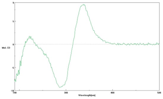 The relative conformation of penicitroamide (1) was established by NOESY correlations. In the NOESY spectrum, the correlation from 3.35 (H-4) to 4.65 (H-5) proved the cis relationship between H-4 and H-5 (see Figure 2). Since compound 1 was a bridge-ring compound, the groups on the two bridgehead carbons must lie on the same side. The correlations from 4.65 (H-5) to 0.99 (H-28) and from 3.29 (H-9) to 1.07 (H-29) established the relative conformations of C-4, C-5, C-8 and C-9 (see Figure 2), meaning that the H-4, H-5, H-28, H-9 and H-29 were all a cis relationship in the core [5/6/5] ring systems. Unfortunately, the relative conformation of H-19 could not be determined using hints from the NOESY spectrum and the methyl group (H-30) located in the linear chain structure. The CD spectrum of penicitroamide (1) showed a positive Cotton effect at 360 (+7.3) and 220 (+1.4) nm and a negative Cotton effect at 281 (−7.8) nm (see Figure 3), and the value of specific optical rotation was −19 with the concentration of 0.01 mg/mL in the CH3OH solvent. Since the physical state is an oil, we cannot determine the absolute configuration of six chiral carbons using X-ray diffraction of penicitroamide (1), and only the relative configuration of penicitroamide (1) was reported in this paper.