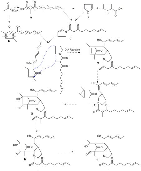 Apparently, there was a proline core pyrrole ring in the structure of compound 1; the pyrrole ring was possibly derived from proline by the decarboxylation reaction by the proline decarboxylase (see Scheme 1). The other parts of 1 can be decomposed into two polyketide parts, a and b (see Scheme 1). The two polyketide parts, a and b, could originate from the two six-acetyl coenzyme units in different binding modes, respectively. Furthermore, part a and part c could possibly be formed from the intermediate d by amidation. Then, the intermediates b and d could combine together to form the nucleus structure of 1 by the Diels-Alder reaction. Finally, the intermediate e could undergo epoxidation, epoxide cleavage, oxidation and hydroxylation resulting in compound 1.