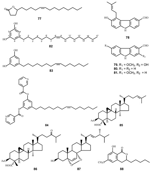 Anti-TB bioassay-directed fractionation of the extract of the stem bark of Micromelum hirsutum Merr. (Rutaceae) collected from the Cuc Phuong National Park (Vietnam) led to the isolation of six carbazole alkaloids, as well as the γ-lactone derivative of oleic acid [35]. Five of the isolates (77–81) showed anti-TB activity. Among the active compounds, a fatty acid lactone, (−) Z-9-octadecen-4-olid (77) showed promising in vitro anti-TB activity with a MIC value (the drug concentration effecting an inhibition of 90% or greater) of 1.5 µg/mL with a selectivity index (SI) of 63 based on its cytotoxicity against the VERO cells, and exhibited activity against the Erdman strain of M. tuberculosis in a J774 mouse macrophage model with an EC90 value of 5.6 μg/mL) [35]. This suggested (−) Z-9-octadecen-4-olid might be a potential new anti-TB agent and worthy of further study.