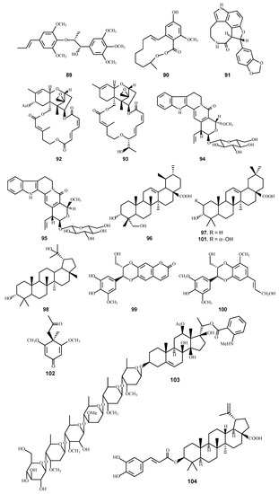 Through collaborations established with several institutes in Vietnam, Laos, and the United States, the leave/stem extracts of Rhaphidophora decursiva (Roxb.) Schott (Araceae), found in the Cuc Phuong National Park, were shown to be active against both the D6 and W2 clones of P. falciparum with IC50 values less than 4 μg/mL [48]. Bioassay-directed fractionation led to the isolation of 18 compounds from the dried leaves and stems of R. decursiva, six (89–93) of them possessed antimalarial activity [43,47,48].