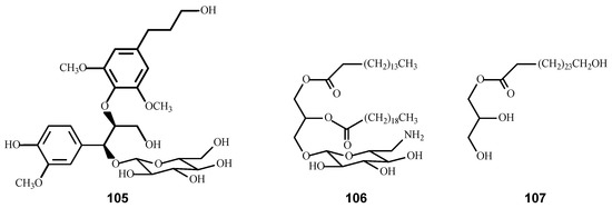 Gongronema napalense (Wall.) Decne. (Asclepiadaceae) (synonym: Gymnema napalense Wall.), known as “Kheuang nguan mu” in Laos, is used locally in combination with one other species to treat polio, and this plant had also been previously reported for the treatment of leucorrhea, blennorrhea, and traumatic injury [49,51]. Bioassay-guided fractionation of the CHCL3 extract of this plant led to the isolation of a new steroidal glycoside, gongroneside A (103), with an IC50 value of 1.60 and 1.39 μM against the P. falciparum D6 and W2 clones, respectively [49].